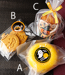 A.かぼちゃのドーナツ 300円(税込) B.ハロウィンクッキー(2枚入り) 200円(税込) C.かぼちゃのカップケーキ 300円(税込) ※全店で販売 |